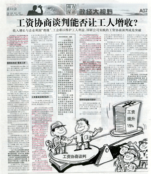 7月14日,《南方日报》以《工资协商谈判能否让工人增收?——国研公司实践的工资协商谈判或是突破》为题,用三分之二大版篇幅报道广州市MK.COM设备制造有限公司实践工资集体协商的成功经验。